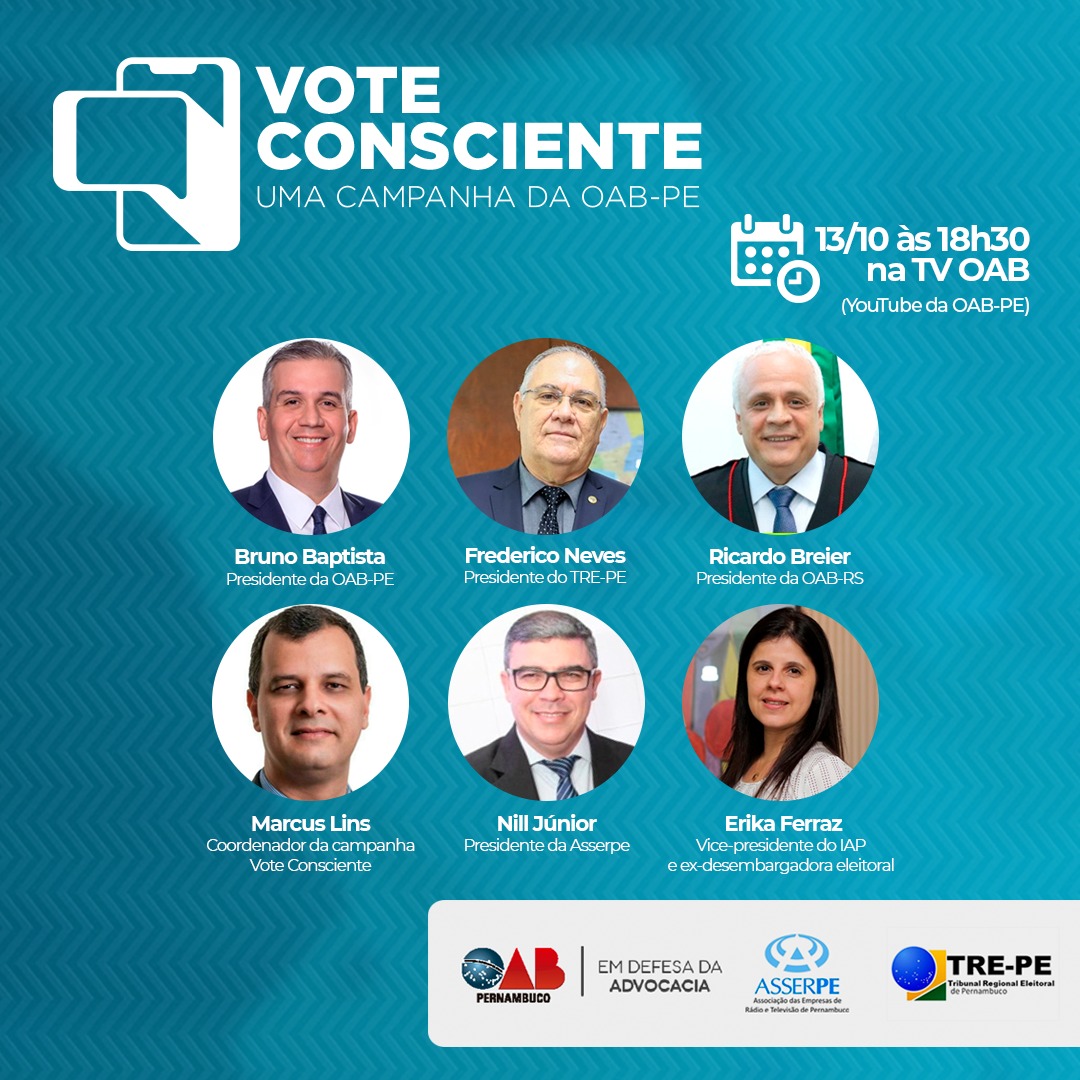 LANÇAMENTO - O Vote Consciente será lançada em um ato transmitido ao vivo pelo canal da TV OAB-PE no YouTube nesta quarta-feira, às 18h30, que contará com as presenças do presidente da OAB-PE, Bruno Baptista; o presidente do TRE-PE, Frederico Neves; o presidente da OAB Rio Grande do Sul, Ricardo Breier, seccional da OAB pioneira deste tipo de iniciativa; o coordenador do projeto na OAB-PE, Marcus Lins; a advogada, vice-presidente do Instituto dos Advogados de Pernambuco e ex-desembargadora do TRE-PE, Erika Ferraz; e o presidente da Asserpe, Nill Júnior.