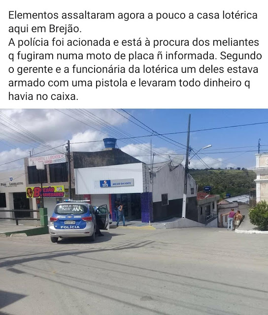 Deu nas redes sociais o assalto ocorrido por volta das 13 horas desse sábado, 14/09, do assalto a Casa Lotérica do município de Brejão, distante 25 km da cidade de Bom Conselho. Até o fechamento dessa reportagem a polícia não prendido ninguém envolvido ou acusado da lotérica.